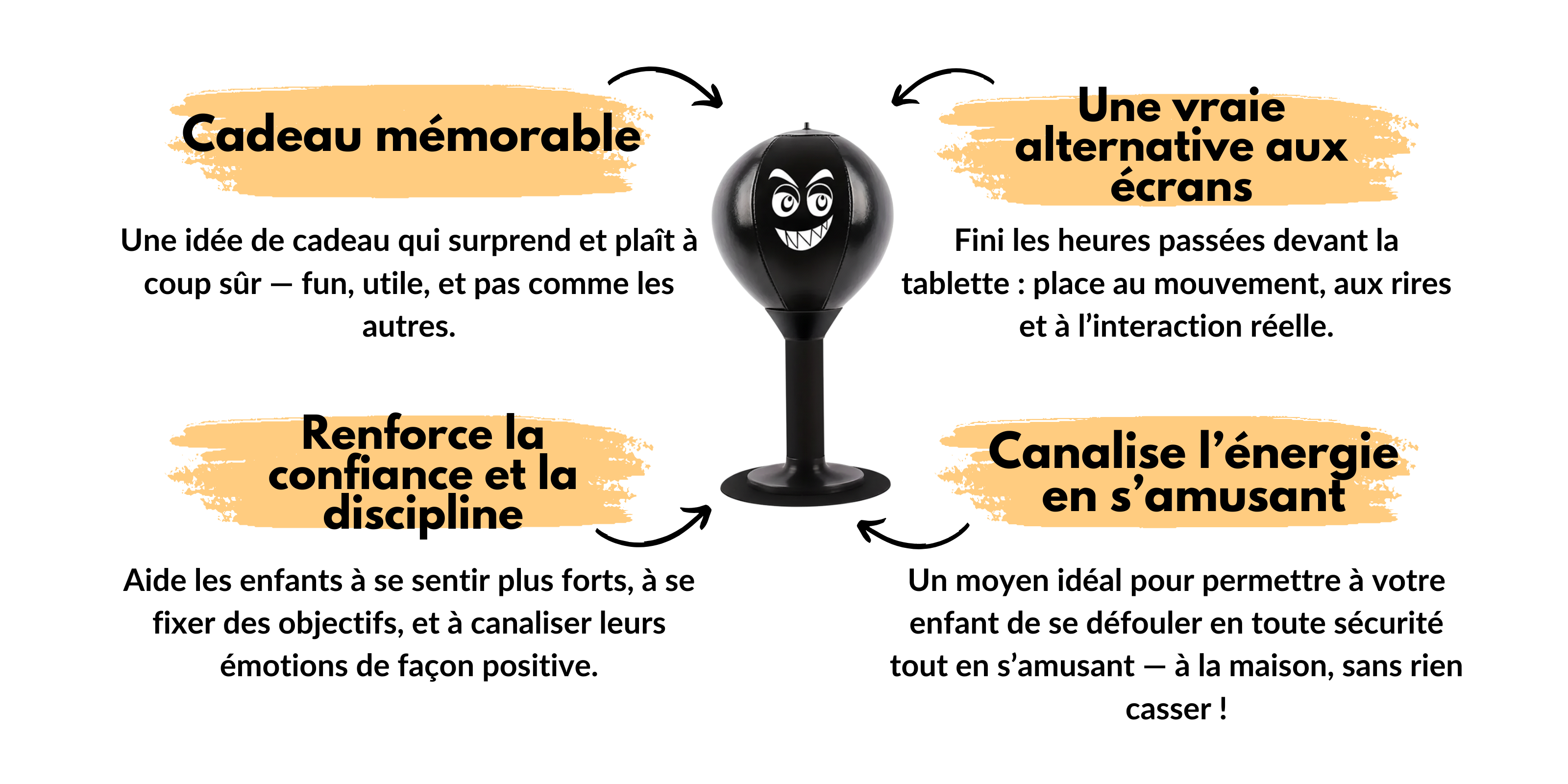 Punchy Kid permet aux enfants de libérer leur stress, leur frustration et leur énergie de manière ludique et non destructrice. Il développe aussi la motricité, la coordination œil-main, la concentration et leur donne un vrai sentiment d’accomplissement grâce à l’activité physique.
